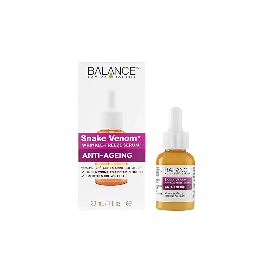 Smooth away wrinkles and fine lines with Balance Active Formula Snake Venom Wrinkle Freeze Serum 30ml. This scientifically formulated serum is an excellent addition to your online shopping in Sri Lanka for anti-aging care. Inspired by synthetic snake venom, it works by relaxing facial muscles to diminish the appearance of wrinkles and create a smoother complexion.