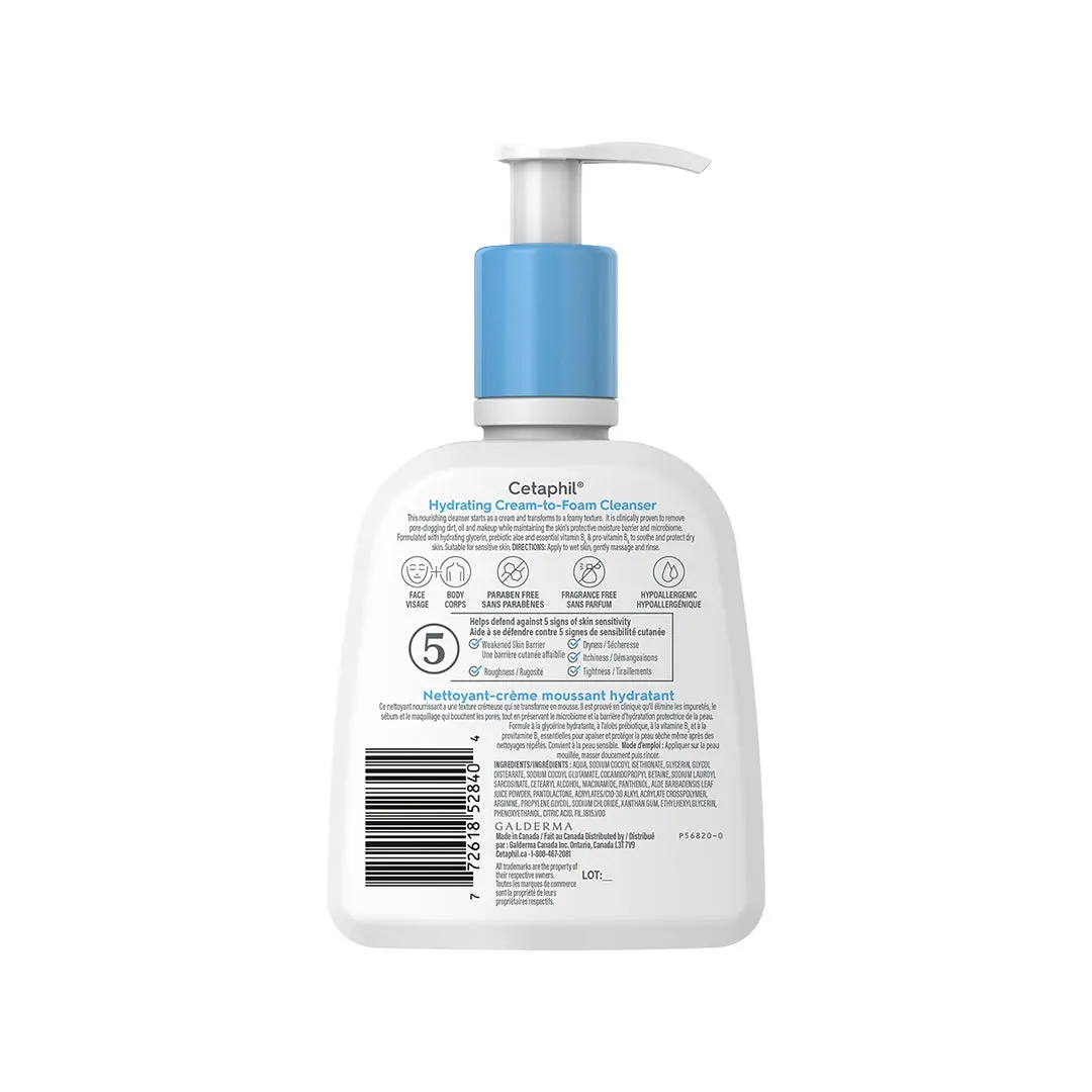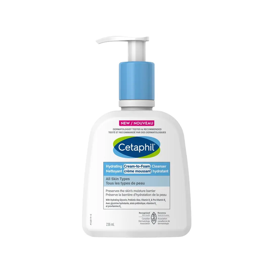 Cleanse and hydrate your skin with Cetaphil Hydrating Cream-to-Foam Cleanser. This gentle, soap-free formula transforms from a cream to a rich foam, effectively cleansing without stripping your skin’s natural moisture. It leaves skin feeling hydrated and smooth, never dry, tight, or greasy.