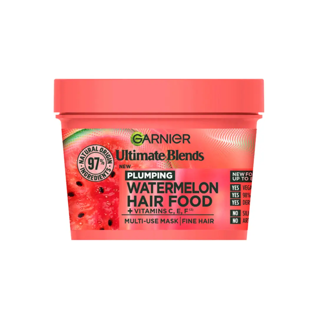 Plump up your fine hair with Garnier Ultimate Blends Plumping Hair Food Watermelon Mask. This 390ml treatment is intensely hydrating and features a melting texture that instantly absorbs into your hair without weighing it down.