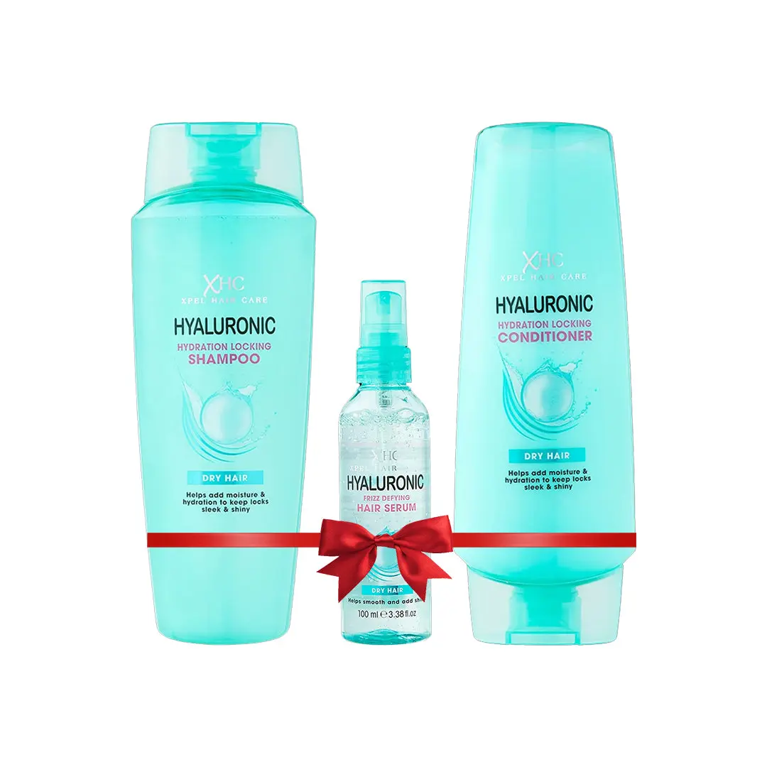 Revitalize your hair with the Xpel Hair Care Hyaluronic Hydration Trio. This set includes shampoo, conditioner, and serum, all infused with hyaluronic acid, grape seed oil, and coconut water to deeply moisturize and strengthen your hair. Say goodbye to dryness, frizz, and brittleness.