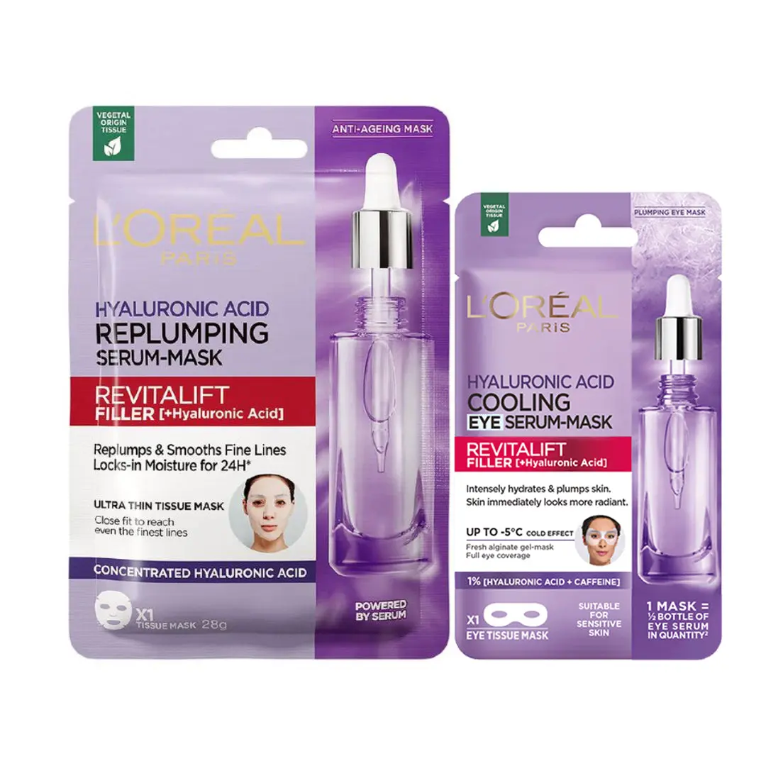 Introducing the L’Oreal Revitalift Filler Tissue Mask and Cooling Eye Serum Mask Bundle Pack. This set is designed to deeply hydrate and revitalize your skin, leaving it looking radiant and feeling firmer. The tissue mask perfectly contours to your face, reaching even the finest lines for a smooth finish.