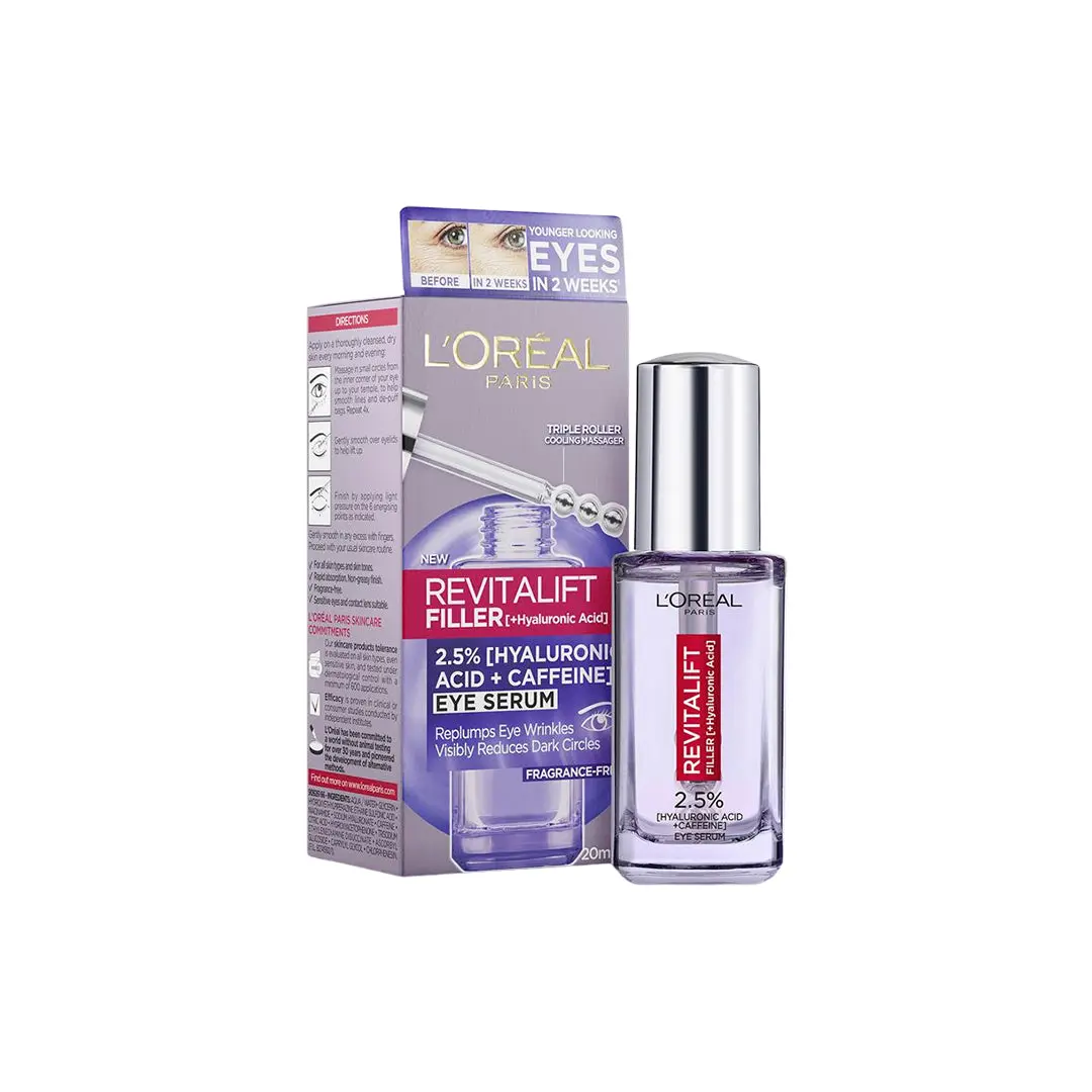 Rejuvenate your eyes with the L’Oreal Revitalift Filler 2.5% Hyaluronic Acid + Caffeine Eye Serum. This expertly formulated serum effectively reduces eye lines, dark circles, and puffiness for a more youthful appearance. The innovative Triple Roller applicator provides a refreshing massage, enhancing product absorption.