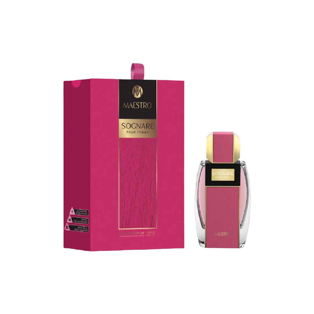 Embrace your feminine charm with Maestro Sognare Pour Femme Eau de Parfum. This opulent fragrance opens with sparkling citrus and juicy fruits, evolving into a beautiful bouquet of jasmine, rose, and peony. The scent settles into a warm, alluring base of vanilla, sandalwood, and musk, leaving a sophisticated and lasting impression.