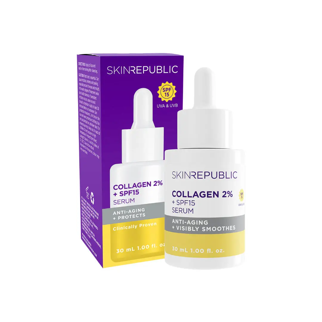 Introducing the Skin Republic Collagen 2% + SPF15 Serum, your new anti-aging essential. This serum is formulated with 2% Collagen to hydrate the skin and minimize the appearance of fine lines and wrinkles. Plus, it offers broad-spectrum SPF15 protection against UVA and UVB rays.