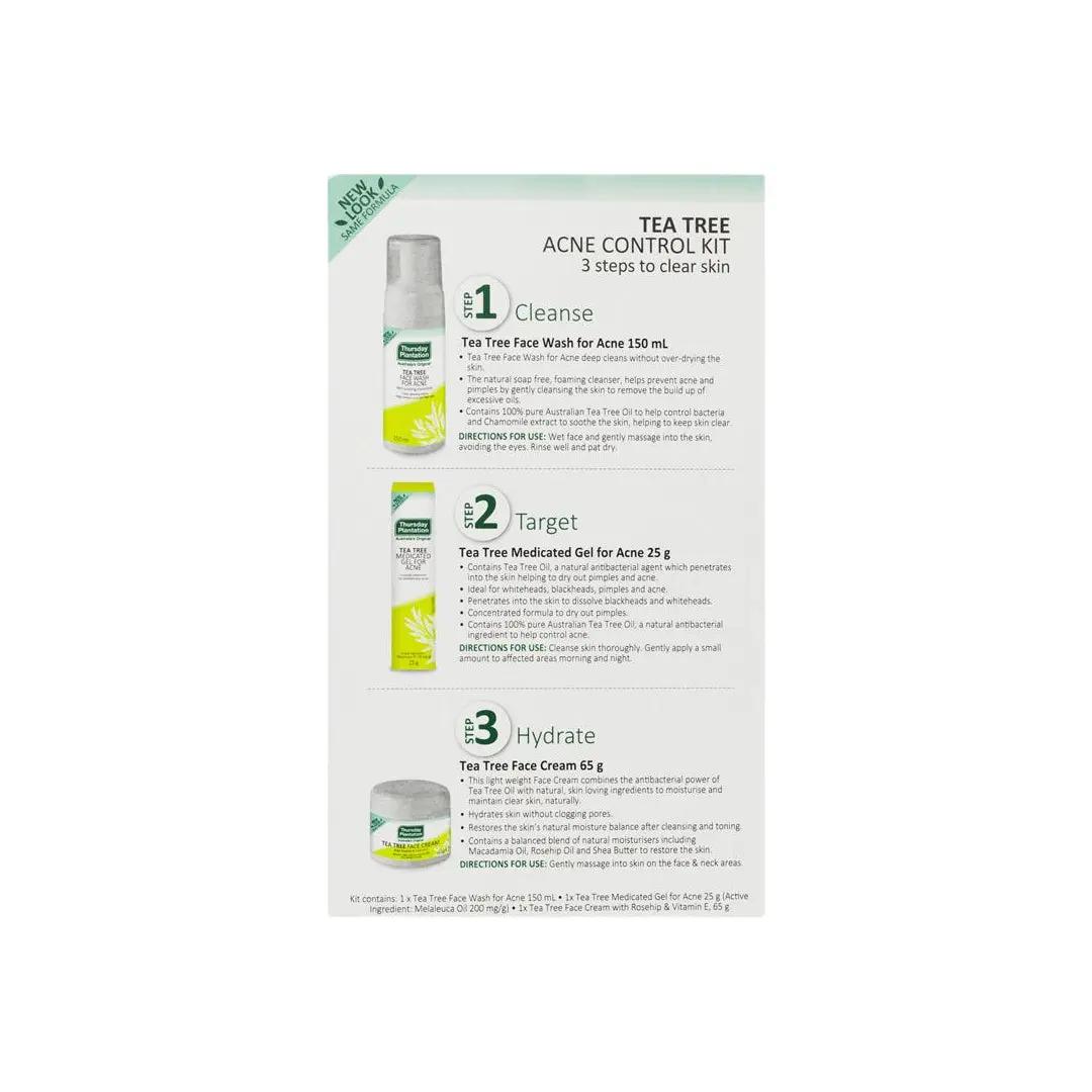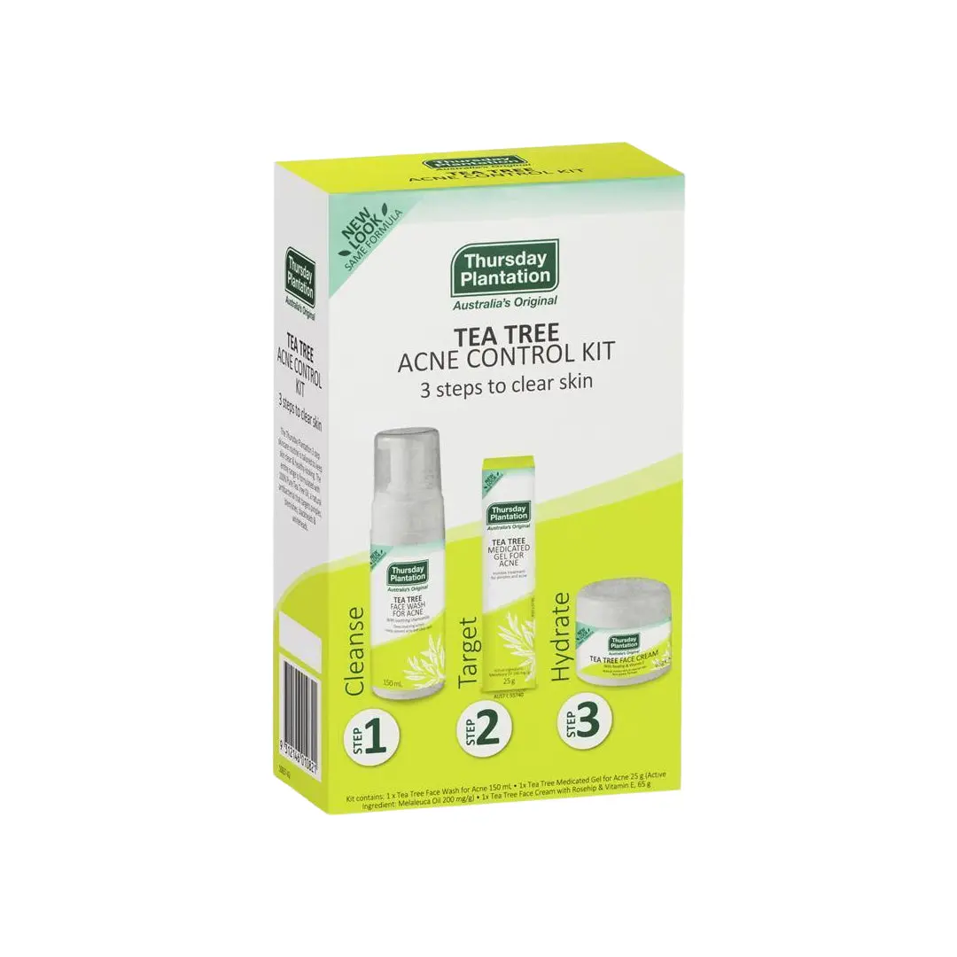 Take control of your skin with the Thursday Plantation Tea Tree Acne Control Kit. This complete 3-step routine features 100% pure Australian Tea Tree Oil, a natural antibacterial that effectively combats acne, pimples, and blemishes. Achieve clearer, healthier-looking skin with this powerful kit.